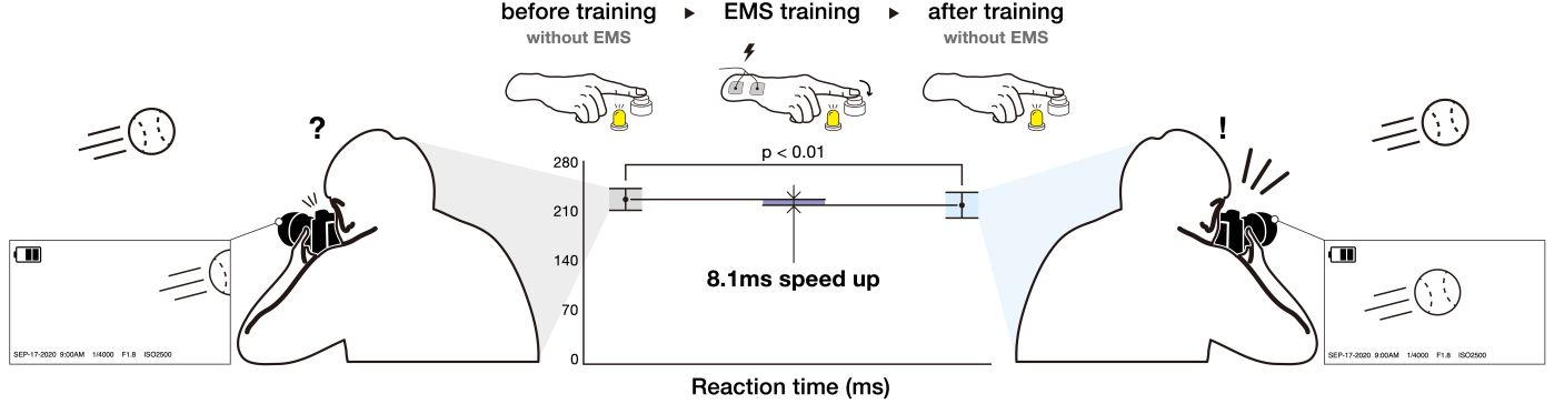 Shunichi Kasahara, Kazuma Takada, Jun Nishida, Kazuhisa Shibata, Shinsuke Shimojo and Pedro Lopes . 2020, Preserving Agency During Electrical Muscle Stimulation Training Speeds up Reaction Time Directly After Removing EMS. In Proceedings of the 2021 CHI Conference on Human Factors in Computing Systems (CHI ’21). Association for Computing Machinery, New York, NY, USA. DOI:https://doi.org/10.1145/3411764.3445147
