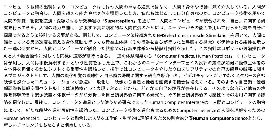 テクノロジーの急速な発達に伴い、コンピュータは単なる道具ではなく、我々の身体や行動に深く介在しています。人間がコンピュータと融合し、人間本来を超えた能力や異なる身体を獲得する時、私たちはどこまで自分自身なのか。我々はコンピュータ技術を用いて人間の知覚や認知を拡張・変容させる研究「Superception」を通じて、人間とコンピュータが融合した時の「自分」がどのように形成されうるのかを研究しています。本講演では、人間-コンピュータ融合時の自己に関する一連のプロジェクトと、そこから提起される、AI/ロボットを含むコンピュータと人間の拡張された主体性、アイデンティティの帰属、責任問題に関して話題の提供を行う。