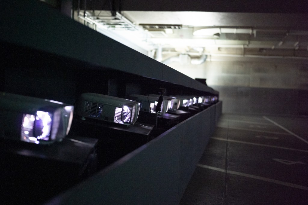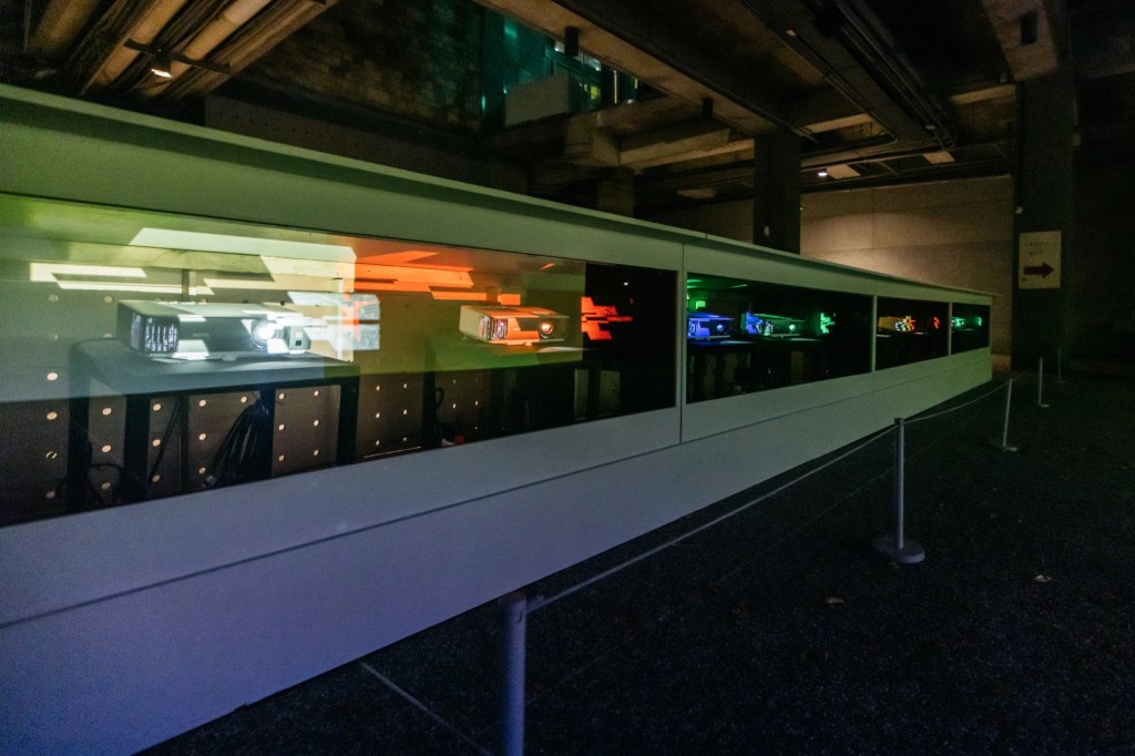 Fragment Shadow system hardware consists multiple (up to 16) projectors and a horizontal wide large flat white screen (up to 15m wide x 3m height), a Computer with GPU (AMD Radeon Pro WX9100).
