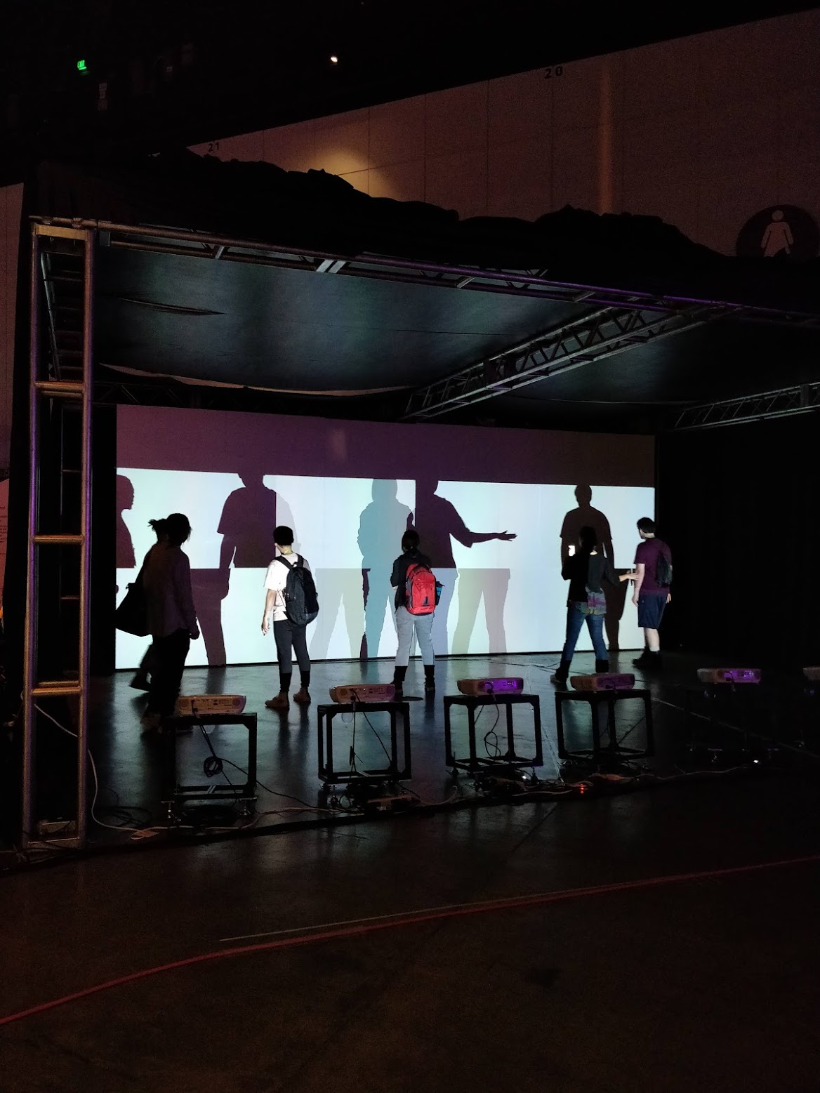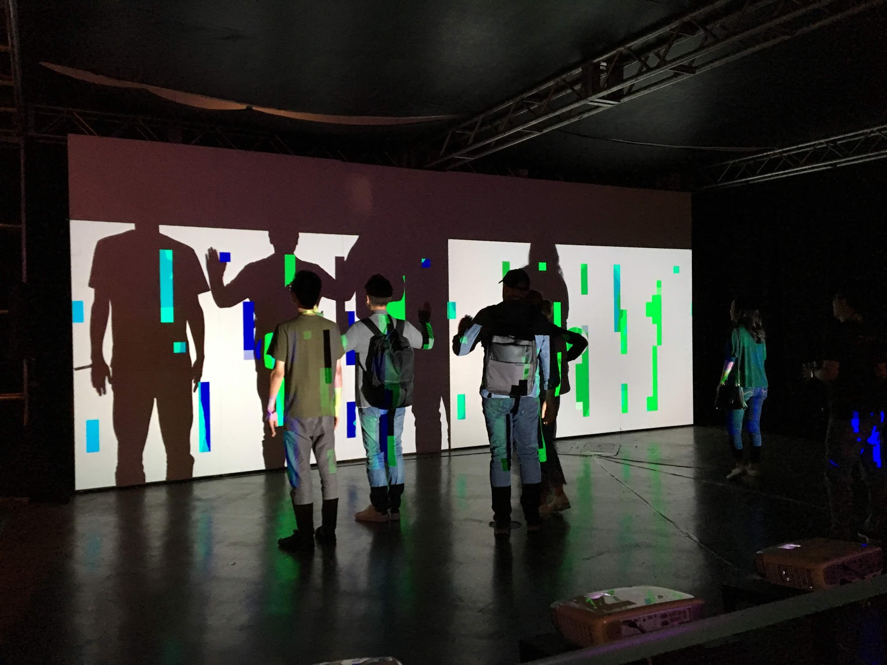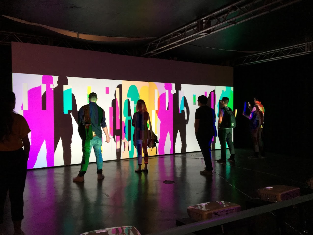 When human bodies or objects enter the projection space, the occlusion of one projector reveals images from other projectors. Then Fragment Shadow enables generating various visual expression in the optical shadow, not just like usual black shadow.