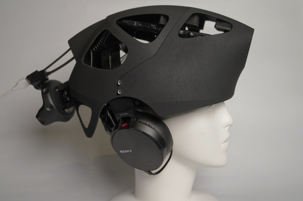 実世界視覚拡張のための装着型Mixed Reality装置。広角変換レンズ、小型レーザープロジェクタ、ヘッドフォン、ヘッドトラッキング装置等で構成される。リアルタイム映像補正により、ユーザの視点から対角線上で最大131度の広角視覚投影を実現し、目を覆うことなく、人間の大部分の視野をカバーする映像投影を可能にする。さらに、ヘッドトラッキングと3次元空間情報によるプロジェクションマッピングによって、装着者が向いている方向へ投影された映像はその物理環境に存在しているように見える。