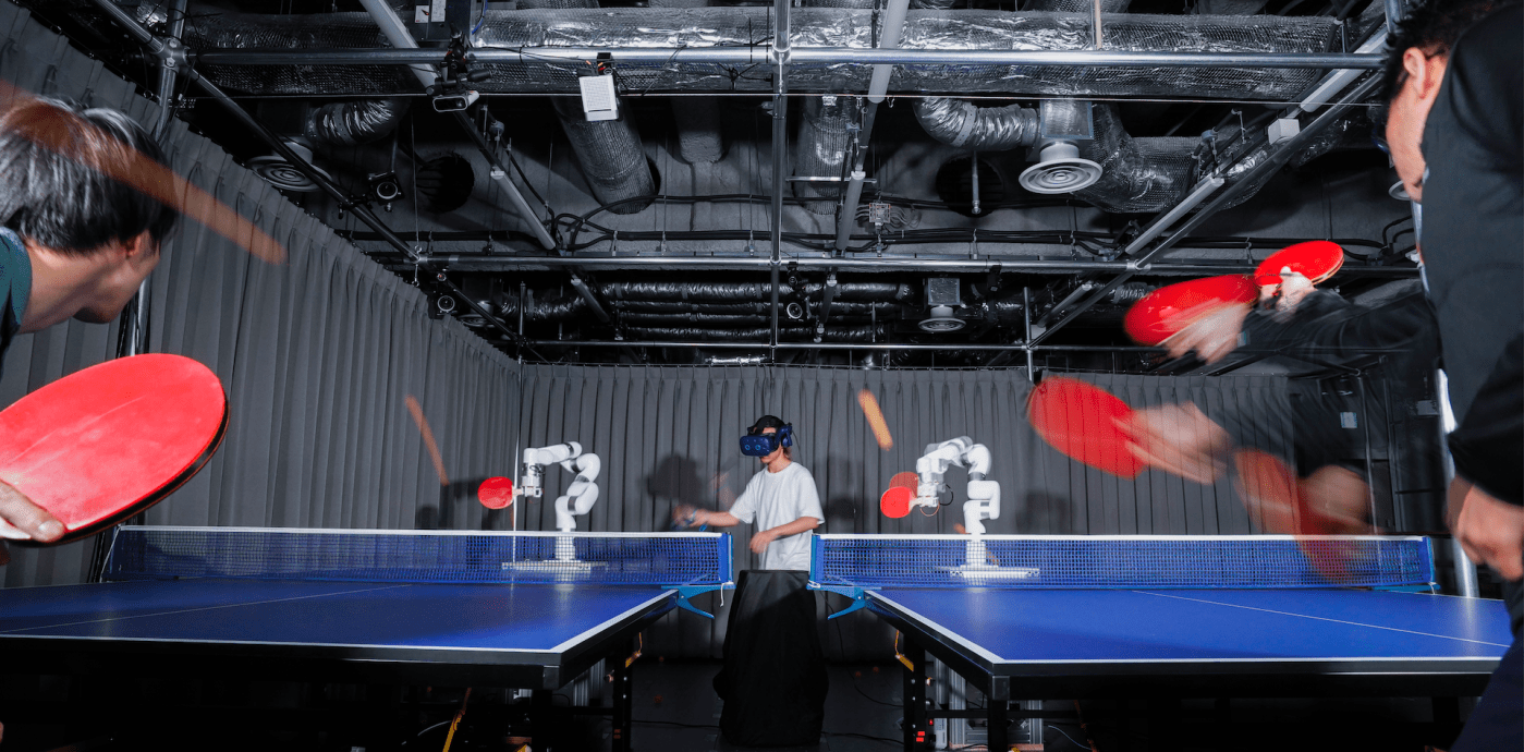1人のユーザが複数の身体を同時に操作する「パラレル・インタラクション」を探求するための物理的プラットフォームとして、卓球を題材とした「パラレル・ピンポン」を開発しました。ユーザは,2本のロボットアームをバーチャルリアリティコントローラで操作し,ヘッドマウントディスプレイを通して2台のロボットアームの視点映像を見ながら2つのテーブルで同時に卓球をできます。ゲーム状況やピンポン玉の方向や位置に応じて、複数視点映像を分割・合成した映像をヘッドマウントディスプレイに表示することで、2つの視点環境を同時に観測することを可能にします。さらに、映像やシステムのレイテンシーによって損なわれてしまうロボットアームに対する行為主体性を維持するために、ボールの軌道計算によるロボットアーム自動制御とユーザー自身の動作を統合することで、複数ロボットアームを1人のユーザーが主体性を持ち制御することを実現します。パラレル・ピンポンは一人のユーザが複数の身体を持ち、並行して身体体験を行うための様々なデザインを検証するためのプラットフォームとなることが期待されます。
